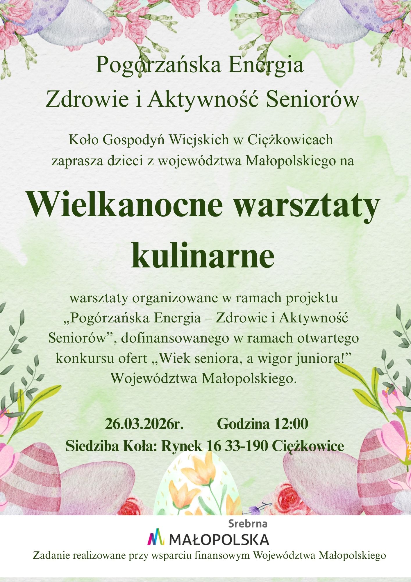 KGW w Ciężkowicach w ramach realizowanego projektu pn. "Pogórzańska Energia zdrowie i aktywność seniorów" zaprasza na Wielkanocne warsztaty kulinarne. Szczegóły na plakacie poniżej: