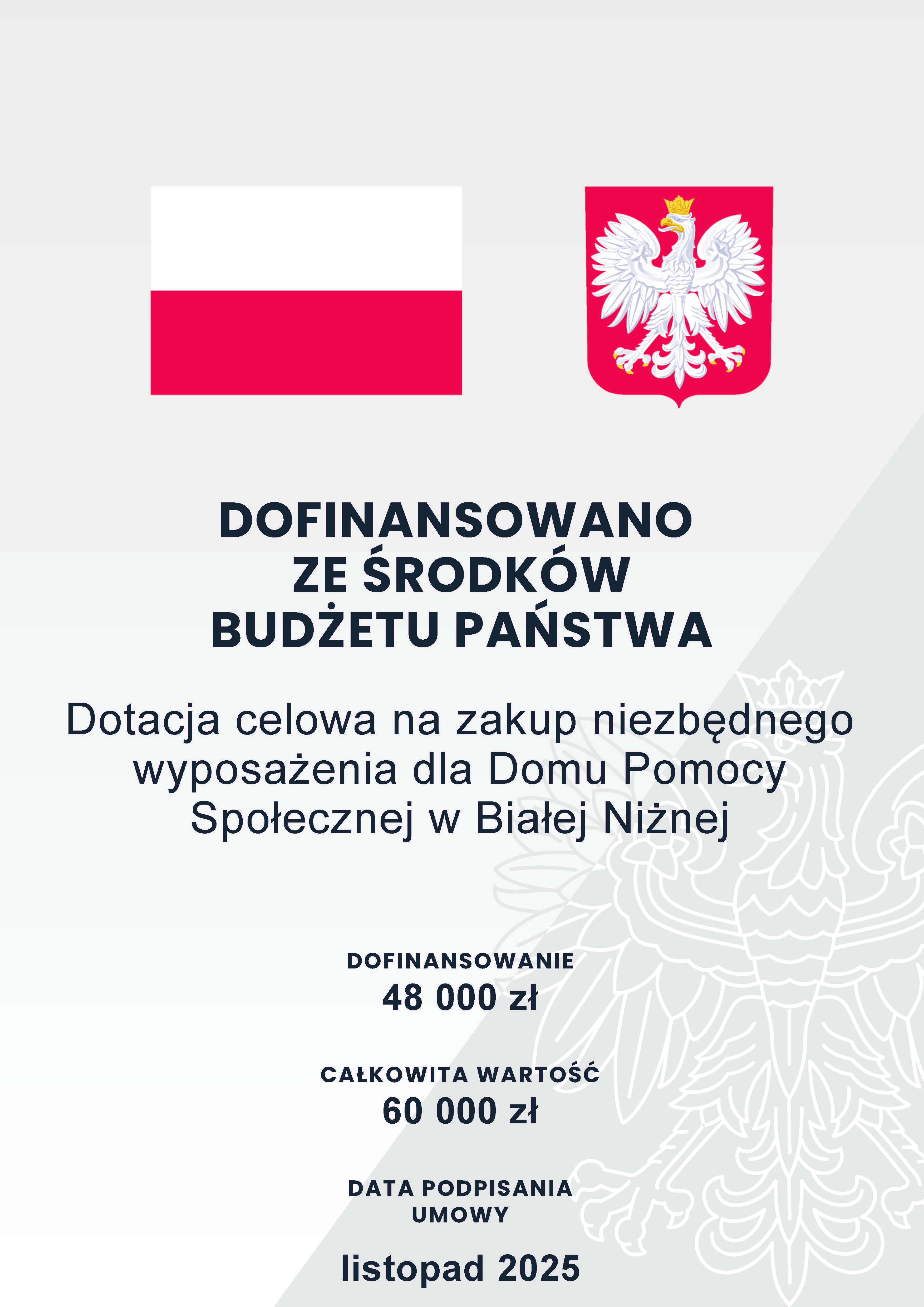 Dotacja celowa na dofinansowanie zadania własnego określonego w art. 17 pkt 2 ust. 3 ustawy o pomocy społecznej polegającego na prowadzeniu i zapewnieniu miejsc w Domu Pomocy Społecznej w Białej Niżnej – zakup niezbędnego wyposażenia.